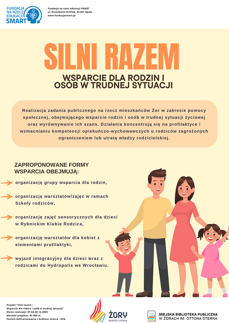 Współczesne rodziny zmagają się z wieloma wyzwaniami, które mogą prowadzić do trudnych sytuacji życiowych i osłabienia relacji wewnątrzrodzinnych. Projekt „Silni razem – Wsparcie dla rodzin i osób w trudnej sytuacji” został stworzony z myślą o mieszkańcach Żor, którzy potrzebują wsparcia w budowaniu bezpiecznego i zdrowego środowiska rodzinnego.